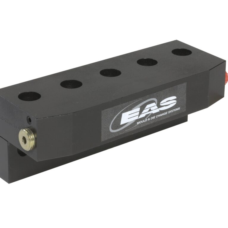 El colector de sujeción MLC incluye 4, 6 u 8 cilindros modulares de simple efecto con retorno por muelle. Los colectores están montados en el lado de la mesa, lo que permite que el troquel se cargue desde el lado operativo hacia un tope fijo.