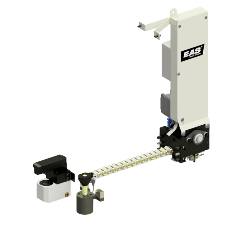 Il morsetto per stampi mobili EAS (ETDC) è progettato per bloccare automaticamente gli utensili sul letto superiore della pressa. Il movimento del morsetto avviene tramite energia elettrica, il bloccaggio avviene tramite energia idraulica. I sistemi di bloccaggio stampi di questo tipo sono collegati a una catena e azionati da un motore elettrico. Gli ETDC appartengono al gruppo di apparecchiature di automazione per il cambio stampi che riducono i tempi di configurazione (SMED). L’ETDC può essere dotato di tre diversi morsetti idraulici. Ciò consente soluzioni flessibili su presse per stampaggio e macchine per stampaggio a iniezione verticali.